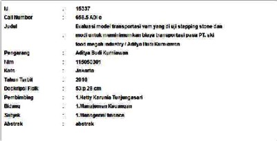 Kurniawan, Aditya Budiman (2010) Evaluasi model transportasi vam yang di uji stepping stone dan modi untuk meminimumkan biaya transportasi pasa PT. ski food megah industry. Informasi Detail Skripsi. p. 53. ISSN 115050301