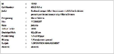 Shietra, Riana (2010) Evaluasi pengambilan keputusan multi kriteria dalam penentuan lokasi season city. Informasi Detail Skripsi. p. 92. ISSN 115060297