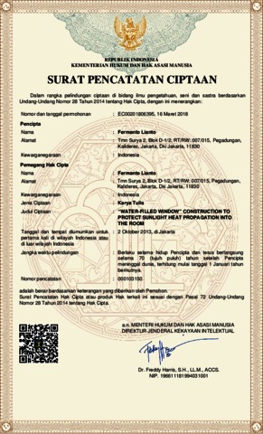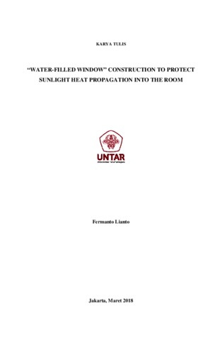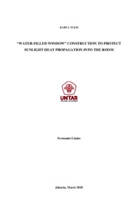 The Earth's surface Temperatures is increasing from year to year. Many things can cause a temperature rise on earth, like the sun’s rising temperatures, global warming process, and the destruction of the ozone layer. There are several things that can cause damage to the ozone layer, one of which is gas CFC (Chlorofluorocarbons) resulting from the use of Air Conditioner (AC) to lower the temperature in the room. As we know, the use of glass windows in the room, besides penetrating sunlight, is also one of the causes of influx of heat from the sun, so the type, thickness and construction of a glass window that is used will greatly affect the temperature in the room that lead to efficiency in the use of air conditioning. Window construction using clear glass+water+clear glass is believed to protect heat propagation into the room from the sun's heat source, so there is a difference between the outside temperature and the inside temperature in the room. This observation and research window construction using clear glass+water+clear glass as called as “water-filled window” contruction will compare with different thicknesses of glass and water to see the temperature difference, outside and inside the room, and to see the ability of the construction to protect the heat propagation of sunlight into the room, how long the propagation of sunlight is able retained into the room, and calculate how much energy can be saved using the “water-filled window” construction.