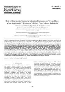 Lianto, Fermanto and Arifin, Lilianny Sigit and Dwisusanto, Y. Basuki (2017) Role of Corridor in Territorial Meaning Formation in “Owned Low-Cost Apartments” (‘Rusunami’) Bidara Cina, Jakarta, Indonesia. International Journal on Advanced Science, Engineering and Information Technology, 7 (2). pp. 399-405. ISSN 2088-5334