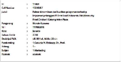 Kusuma, Marvin (2010) Faktor determinan dari kualitas pelayanan terhadap kepuasan pelanggan PT Fast Food Indonesia,Tbk (Kentucky Fried Chicken) Cabang Arion Plaza. Informasi Detail Thesis. p. 80. ISSN 117082810