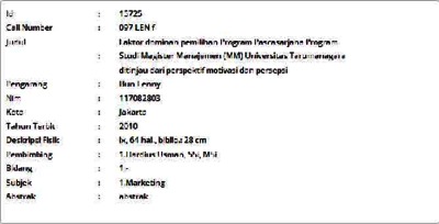 Lenny, Bun (2010) Faktor dominan pemilihan Program Pascasarjana Program Studi Magister Manajemen (MM) Universitas Tarumanagara ditinjau dari perspektif motivasi dan persepsi. Informasi Detail Thesis. p. 64. ISSN 117082803
