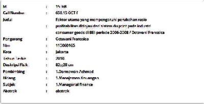 Franssisca, Octaviani (2010) Faktor utama yang mempengaruhi perubahan rasio profitabilitas ditinjau dari sistem du pont pada industri consumer goods di BEI periode 2006-2008 / Octavani Franssica. Informasi Detail Skripsi. p. 82. ISSN 115060165