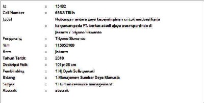 Siswanto, Triyono (2010) Hubungan antara Gaya Kepemimpinan untuk Motivasi Kerja Karyawan pada PT. Berkat Abadi Ajaya Trasnsportindo di Jakarta. Skripsi thesis, Universitas Tarumanagara.