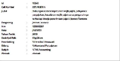 Tantono, Jennet (2010) Hubungan antara Kepatuhan Wajib Pajak, Pelayanan Perpajakan, Kesadaran Wajib Pajak serta Pengaruhnya terhadap Kinerja Penerimaan Pajak. Skripsi thesis, Universitas Tarumanagara.