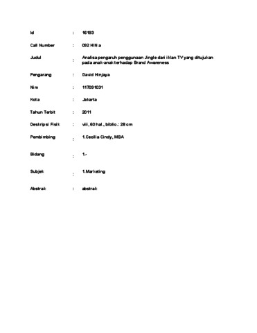 Hinjaya, David Analisa pengaruh penggunaan Jingle dari iklan TV yang ditujukan pada anak-anak terhadap Brand Awareness. thesis.