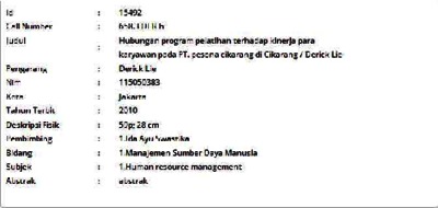 Lie, Derick (2010) Hubungan Program Pelatihan terhadap Kinerja Para Karyawan pada PT. Pesona Cikarang di Cikarang. Skripsi thesis, Universitas Tarumanagara.