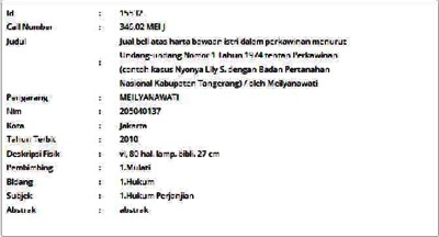 Meilyanawati, Meilyanawati (2010) Jual beli atas harta bawaan istri dalam perkawinan menurut Undang-undang Nomor 1 Tahun 1974 tentan Perkawinan (contoh kasus Nyonya Lily S. dengan Badan Pertanahan Nasional Kabupaten Tangerang) / oleh Meilyanawati. Informasi Detail Skripsi. p. 80. ISSN 205040137