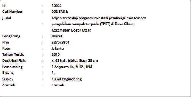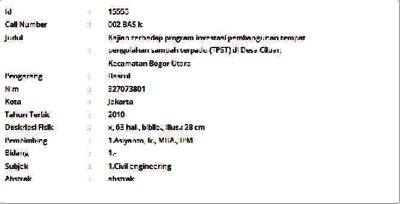 Basrul, Basrul (2010) Kajian terhadap program investasi pembangunan tempat pengolahan sampah terpadu (TPST) di Desa Ciluar, Kecamatan Bogor Utara. Masters thesis, Universitas Tarumanagara.