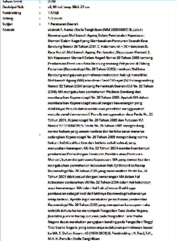 A. Nama : Stella Tangkilisan (NIM 205060057) B. Judul : Kewenangan Mahkamah Agung Dalam Pembatalan Keputusan Menteri Dalam Negeri yang Membatalkan Peraturan Daerah Kota Bandung Nomor 26 Tahun 2001 C. Halaman : vii + 90 + lampiran D. Kata Kunci : Mahkamah Agung, Pembatalan, Keputusan Menteri. E. Isi : Keputusan Menteri Dalam Negeri Nomor 20 Tahun 2005 tentang Pembatalan Peraturan Kota Bandung tentang Pelayanan di Bidang Pertanian (Kepmendagri No. 20 Tahun 2005) membuat Walikota Bandung mengajukan permohonan keberatan hak uji materiil ke Mahkamah Agung (MA) atas dasar Pasal 145 ayat (5) Undang-undang Nomor 32 Tahun 2004 tentang Pemerintah Daerah (UU No. 32 Tahun 2004). MA mengabulkan permohonan Walikota Bandung dan membatalkan Kepmendagri No. 20 Tahun 2005. Apakah MA dalam membatalkan Kepmendagri sesuai dengan kewenangan yang dimilikinya? Penulis dalam melakukan penelitian menggunakan metode penelitian normatif. Penulis menggunakan data Perda No. 26 Tahun 2001, Kepmendagri No. 20 Tahun 2005 dan Putusan MA Nomor 17 P/HUM/2005. Perda No. 26 Tahun 2001 mengandung norma hukum yang umum-konkret dan berlaku terus menerus sedangkan Kepmendagri No. 20 Tahun 2005 mengandung norma hukum individual-konkret dan berlaku sekali selesai, yang merupakan ketetapan. UU No. 32 Tahun 2004 memberikan bentuk pembatalan Perda dengan Peraturan Presiden atau Peraturan Menteri, bukan dengan suatu keputusan. MA yang memeriksa dan mengabulkan permohonan keberatan Hak Uji Materiil terhadap Kepmendagri No. 20 Tahun 2005 yang membatalkan Perda No. 26 Tahun 2001 tidak sesuai dengan kewenangan MA dalam hal keberatan berdasarkan UU No. 32 Tahun 2004 dalam hal keberatan atau kewenangan MA dalam hal hak uji materiil sehingga pembatalan sebagai hasil dari lahirnya Kepmendagri seharusnya tetap berlaku. Apabila ingin melakukan permohonan pembatalan Kepmendagri No. 20 Tahun 2005 yang merupakan ketetapan maka terlebih dahulu harus menempuh Pengadilan Tata Usaha Negara. Jika tidak puas terhadap putusan pada Pengadilan Tata Usaha Negara dapat melakukan pengajuan banding pada Pengadilan Tinggi Tata Usaha Negara, yang seterusnya melakukan permohonan kasasi ke MA. F. Daftar Acuan : 43 (1990-2009) G. Pembimbing : H. Rasji, S.H., M.H. H. Penulis : Stella Tangkilisan