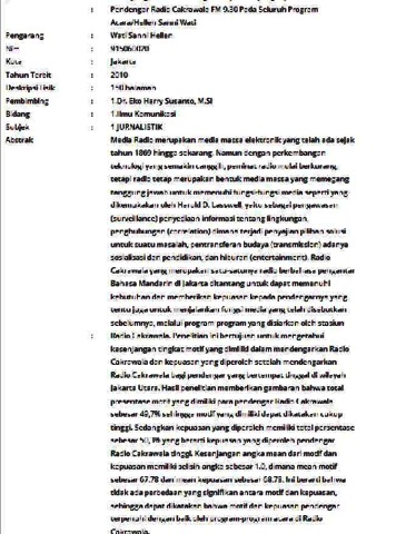 Wati, Sanni Hellen (2010) Motif yang Dimiliki dan Tingkat Kepuasan yang Diperoleh Pendengar Radio Cakrawala FM 9.30 Pada Seluruh Program Acara. Skripsi thesis, Universitas Tarumanagara.