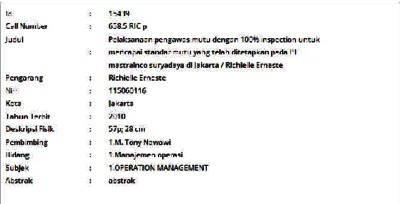 Erneste, Richielle (2010) Pelaksanaan Pengawas Mutu dengan 100% Inspection untuk Mencapai Standar Mutu yang Telah Ditetapkan pada PT Mastrainco Suryadaya di Jakarta. Skripsi thesis, Universitas Tarumanagara.