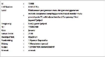 Tjahjadi, Feni Juyanti (2010) Pelaksanaan Pengawasan Mutu dengan Menggunakan Metode Acceptance Sampling Guna Mencapai Standar Mutu Produk pada PT. Adhi Wijaya Kemika di Tangerang. Skripsi thesis, Universitas Tarumanagara.