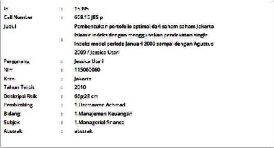 Utari, Jessica (2010) Pembentukan Portofolio Optimal dari Saham-Saham Jakarta Islamic Indeks dengan Menggunakan Pendekatan Single Indeks Model Periode Januari 2009 sampai dengan Agustus 2009. Skripsi thesis, Universitas Tarumanagara.