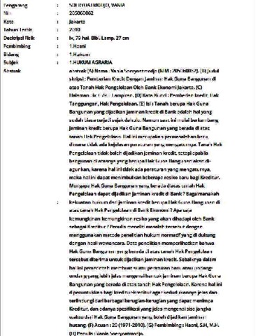 (A) Nama : Vania Soeryoatmodjo (NIM : 205060062). (B) Judul skripsi : Pemberian Kredit Dengan Jaminan Hak Guna Bangunan di atas Tanah Hak Pengelolaan Oleh Bank Ekonomi Jakarta. (C) Halaman : ix + 79 + Lampiran. (D) Kata Kunci : Pemberian kredit, Hak Tanggungan, Hak Pengelolaan. (E) Isi : Tanah berupa Hak Guna Bangunan yang dijadikan jaminan kredit di Bank adalah hal yang sudah biasa terjadi sejak dahulu. Namun saat ini mulai berkembang jaminan kredit berupa Hak Guna Bangunan yang berada di atas tanah Hak Pengelolaan. Hal ini merupakan permasalahan baru, dimana tidak ada kejelasan peraturan yang mengaturnya. Tanah Hak Pengelolaan tidak boleh dijadikan jaminan kredit, tetapi apabila bangunan di atasnya yang berupa Hak Guna Bangunan akan di-agunkan, karena hal ini tidak ada peraturan yang mengaturnya, maka hal ini dapat menimbulkan beberapa resiko baru bagi Kreditur. Mengapa Hak Guna Bangunan yang berada diatas tanah Hak Pengelolaan dapat dijadikan jaminan kredit di Bank ? Bagaimanakah kekuatan hukum dari jaminan kredit berupa Hak Guna Bangunan di atas tanah Hak Pengelolaan di Bank Ekonomi ? Apa saja kemungkinan-kemungkinan resiko yang akan dihadapi oleh Bank sebagai Kreditur ? Penulis meneliti masalah tersebut dengan menggunakan metode penelitian hukum normatif yang di dukung dengan hasil wawancara. Data penelitian memperlihatkan bahwa Hak Guna Bangunan yang berada di atas tanah Hak Pengelolaan tersebut diterima untuk dijadikan jaminan kredit. Sebaiknya dalam hal ini pemerintah membuat suatu peraturan baru atau undang-undang yang lebih jelas mengenai bentuk jaminan berupa Hak Guna Bangunan yang berada di atas tanah Hak Pengelolaan. Karena hal ini diperuntukkan bagi kreditur-kreditur agar kedudukannya jelas dan terlindungi dari berbagai kerugian-kerugian yang dapat menimpa Kreditur, dan adanya spesifikasi yang jelas mengenai sisa jangka waktu dari Hak Guna Bangunan yang boleh dijadikan jaminan hutang. (F) Acuan : 20 (1971-2010). (G) Pembimbing : Hasni, S.H, M.H. (H) Penulis : Vania Soeryoatmodjo.