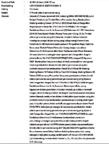 (A) Nama: Jeremiah U.H. Limbong (NIM: 205036018) (B) Judul Skripsi: Pembuktian Tindak Pidana Pencucian Uang Berdasarkan Undang-undang Nomor 25 Tahun 2003 (Studi Kasus: Pengadilan Negeri Jakarta Barat No. 1145/Pid.B/2007/PN.JKT.BAR Dengan Terdakwa Vincentius Amin Sutanto). (C) Halaman: vii + 83 + lampiran, 2010 (D) Kata Kunci: Tindak Pidana Pencucian Uang. (E) Isi: Tindak pidana pencucian uang di Indonesia, semakin tahun semakin meningkat sampai dalam tahap yang cukup mengkhawatirkan. Penelitian ini difokuskan kepada putusan Pengadilan Negeri Jakarta Barat atas Tindak Pidana Pencucian Uang dengan terdakwa Vincentius Amin Sutanto alias Victor Setiawan alias Victor Susanto. Dimana Vincentius sebagaimana diputus oleh Pengadilan Negeri Jakarta Barat No.1145/Pid.B/2007/PN.JKT.BAR, tanggal 09 Agustus 2007. Berdasarkan kasus tersebut, timbul permasalahan mengenai bentuk pembuktian dalam tindak pidana pencucian uang dan praktek beracaranya berdasarkan Pasal 30 s/d Pasal 38 Undang-Undang Nomor 15 Tahun 2002 jo. Pasal 33 Undang-Undang Nomor 25 Tahun 2003 tentang Pencurian Uang mengenai pembuktian tindak pidana pencucian uang pada kasus pencucian uang yang diputus oleh Pengadilan Negari Nomor 1145/Pid.B/2007/PN.JKT.BAR dengan Terdakwa Vincentius Amin Sutanto. Metode penelitian yang digunakan dalam penelitian ini adalah metode penelitian normatif dengan disertai sifat penelitian deskriptif. Dari hasil analisis diketahui bahwa Bentuk pembuktian dalam tindak pidana pencucian uang dan praktek beracaranya berdasarkan peraturan perundang-undangan saat ini adalah pembuktian terbalik sebagaimana diatur dalam Pasal 35 UUTPPU. Selanjutnya mengenai kesesuaian pembuktian tindak pidana pencucian uang pada kasus pencucian uang yang diputus oleh Pengadilan Negari Nomor 1145/Pid.B/2007/PN.JKT.BAR dengan Terdakwa Vincentius AminSutanto berdasarkan peraturan perundang-undangan yang berlaku adalah bahwa telah terjadi kekeliruan penafsiran UUTPPU dalam pembuktian dan pemeriksaan tindak pidana pencucian uang oleh Majelis Hakim Pengadilan Jakarta Barat karena menafsirkan bahwa tindak pidana pencucian uang sebagai tindak pidana yang berdiri sendiri. (F) Acuan: 35 (1964-2008) (G) Pembimbing: Soetan Budhi Satria S., SH., MH. (H) Penulis: Jeremiah U.H. Limbong