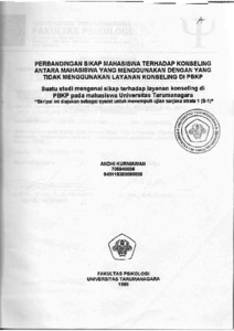 Pusat Bimbingan dan konsultasi Psikologi Universitas Tarumanagara (PBKP UNTAR) dibentuk untuk memberikan pelayanan psikologi, antaranya layanan konseling, yang ditujukan terutama kepada mahasiswa UNTAR dalam membantu mengatasi permasalahan psikologis seperti masalah kesulitan belajar, masalah hubungan orang tua dan teman-teman, dan masalah kepercayaan diri. Latar belakang dilakukannya penelitian ini adlah untuk melihat perbandingan sikap pada mahasiswa UNTAR terhadap konseling antara yang menggunakan dengan yang tisak menggunakan layanan konseling di PBKP. Landasan teoritis yang digunakan antara lain pengertian konseling psikologi menurut George dan Cristiani (1990) dipandang sebagai suatu hubngan proses yang dibentuk untuk membantu manusia mengambil keputusan dan memecahkan permasalahannya. Perilaku seseorang dalam menggunakan atau tidak menggunakan layanan konseling dipengaruhi oleh sikapnya (Baron dan Bryne, 1994). Terdapat 2 jenis sifat sikap yaitu sikap positif yang kecenderungan perilakunya adalah mendekati, menyenangi, dan sikap negatif yang kecenderungan perilakunya adalah menjauhi, menghindari, atau tidak menyukai obyek tertentu (Sarwono, 1991). Metode penelitian yang digunakan adalah metode deskriptif melalui studi pustaka dan analisis berdasarkan pengumpulan data dengan memberikan kuesioner berbentuk skala Likert (instrumen ukur dalam penelitian ini) kepada 60 mahasiswa UNTAR yang masih aktif kuliah sampai tahun ajaran 1997/1998 sebagai respondennya. Pengujian data pada penelitian ini dilakukan dengan menggunakan uji "t" dan berdasarkan pengujian tersebut, diperoleh hasil penelitian yang dapat dinyatakan bahwa terdapat perbedaan sikap yang signifikan terhadap konseling antara mahasiswa UNTAR yang menggunakan dengan yang tidak menggunakan layanan konseling di PBKP dimana mahasiswa UNTAR yang menggunakan layanan konseling memiliki sikap positif dan mahasiswa UNTAR yang tidak menggunakan layanan konseling memiliki sikap negatif terhadap konseling.