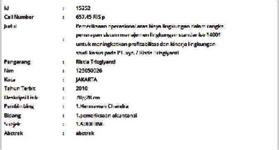 Trisgiyanti, Ristia (2010) Pemeriksaan Operasional atas Biaya Lingkungan dalam Rangka Penerapan Sistem Manajemen Lingkungan Standar ISO 14001 untuk Meningkatkan Profitabilitas dan Kinerja Lingkungan - Studi Kasus pada PT. XYZ. Skripsi thesis, Universitas Tarumanagara.