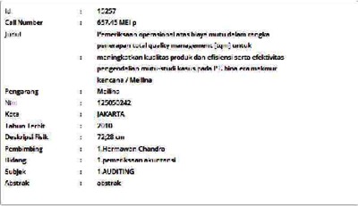 Meilina, Meilina (2010) Pemeriksaan Operasional atas Biaya Mutu dalam Rangka Penerapan Total Quality Management [TQM] untuk Meningkatkan Kualitas Produk dan Efisiensi serta Efektivitas Pengendalian Mutu - Studi Kasus pada PT. Bina Era Makmur Kencana. Skripsi thesis, Universitas Tarumanagara.