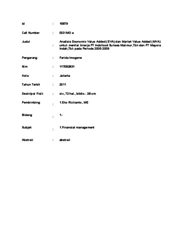 Imogene, Farida (2011) Analisis Economic Value Added (EVA) dan Market Value Added (MVA)untuk menilai kinerja PT Indofood Sukses Makmur,Tbk dan PT Mayora Indah,Tbk pada Periode 2005-2009. thesis.