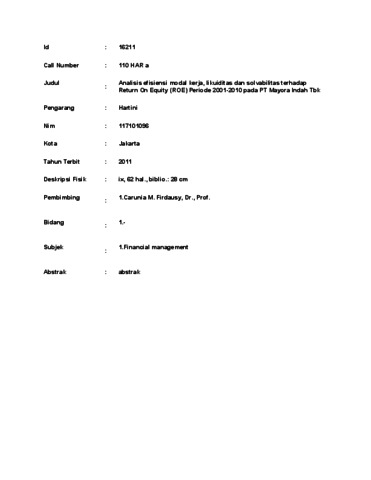 Hartini, Hartini (2011) Analisis efisiensi modal kerja, likuiditas dan solvabilitas terhadap Return On Equity (ROE) Periode 2001-2010 pada PT Mayora Indah Tbk. thesis.