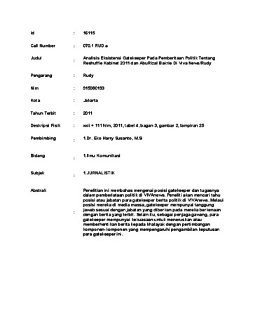 Rudy, Rudy (2011) Analisis Eksistensi Gatekeeper Pada Pemberitaan Politik Tentang Reshuffle Kabinet 2011 dan AbuRizal Bakrie Di Viva News/Rudy. skripsi.
