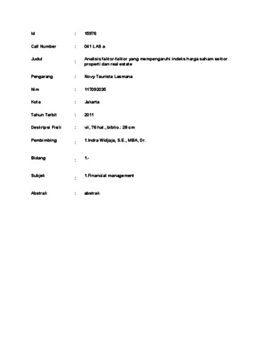 Taurista Lasmana, Novy (2011) Analisis faktor-faktor yang mempengaruhi indeks harga saham sektor properti dan real estate. thesis.