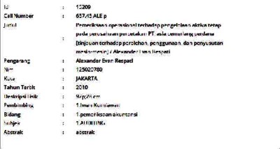 Respati, Alexander Evan (2010) Pemeriksaan Operasional terhadap Pengelolaan Aktiva Tetap pada Perusahaan Percetakan PT. Asia Cemerlang Perdana [Tinjauan terhadap Perolehan, Penggunaan, dan Penyusutan Mesin-Mesin]. Skripsi thesis, Universitas Tarumanagara.
