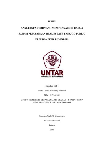 Wibowo, Bella Noviselly (2018) Analisis faktor yang mempengaruhi harga saham perusahaan real estate yang go public di bursa efek indonesia./Bella Noviselly Wibowo. Skripsi thesis, Universitas Tarumanagara.