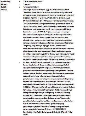 (A) Nama : Yulia Yanto (B) Judul : PENEGAKAN HUKUM TERHADAP PEMBONGKAR RUMAH TUA KAPITAN OEI DJI SAN YANG DIDUGA SEBAGAI BENDA CAGAR BUDAYA DI TANGERANG MENURUT UNDANG-UNDANG RI NOMOR 5 TAHUN 1992 TENTANG CAGAR BUDAYA (C) Halaman : (vii + 73 halaman + 3 Halaman Daftar Pustaka, 2010) (D) Kata Kunci : Penegakan Hukum, Cagar Budaya, UU No. 5 Tahun 1992 (E) Isi : Benda Cagar Budaya merupakan salah satu hasil kebudayaan peninggalan dari nenek moyang kita yang dilindungi kelestariannya oleh UUD 1945. Sejalan dengan perkembangan ekonomi dan pembangunan di Indonesia maka banyak ditemukan kasus dimana sebuah benda cagar budaya dihancurkan atau dibongkar oleh orang-orang yang tidak mengerti akan pentingnya tentang pelestarian kebudayaan. Permasalahan muncul ketika kota Tangerang yang letaknya di pinggir Ibukota Jakarta saat ini mengalami perkembangan yang sangat pesat dimana pembangunan di segala sektor berjalan sangat cepat. Dalam perkembangannya diperlukan prasarana berupa lahan di mana para pelaku bisnis dapat menjalankan kegiatannya. Lahan dengan potensi ekonomi tinggi terdapat di daerah yang strategis, dan biasanya terletak di pusat Kota yang menyebabkan lahan seperti ini sudah semakin langka oleh karena itu nilai tanah di daerah ini bernilai amat tinggi. Hal ini mengakibatkan orang cenderung untuk memanfaatkan setiap jengkal tanah semaksimal mungkin dengan mengabaikan nilai-nilai sejarah, budaya, dan ilmu pengetahuan demi mengeruk keuntungan sebanyak-banyaknya. Inilah yang mendorong terjadinya penghancuran bangunan-bangunan yang mempunyai nilai penting sejarah, kebudayaan dan ilmu pengetahuan. Salah satu contoh kasus yang ditemukan adalah dibongkarnya rumah tua milik Kapitan Oei Dji San di Tangerang. Penulis meneliti tentang penegakan hukum terhadap pembongkar rumah tua Kapitan Oei Dji San yang di duga sebagai benda cagar budaya di Tangerang ini menurut Undang-Undang No. 5 Tahun 1992 tentang Benda Cagar Budaya dengan menggunakan metode penelitian hukum normatif dan metode penelitian hukum empiris. Hasil data penelitian menunjukan bahwa rumah tersebut merupakan Benda Cagar Budaya yang perlindungannya telah diatur oleh undang-undang dan sudah seharusnya tidak dibongkar. (F) Acuan : 38 (1961-2009) (G) Pembimbing : Drs. Teddy Nurcahyawan S.H., M.A. (H) Penulis : Yulia Yanto