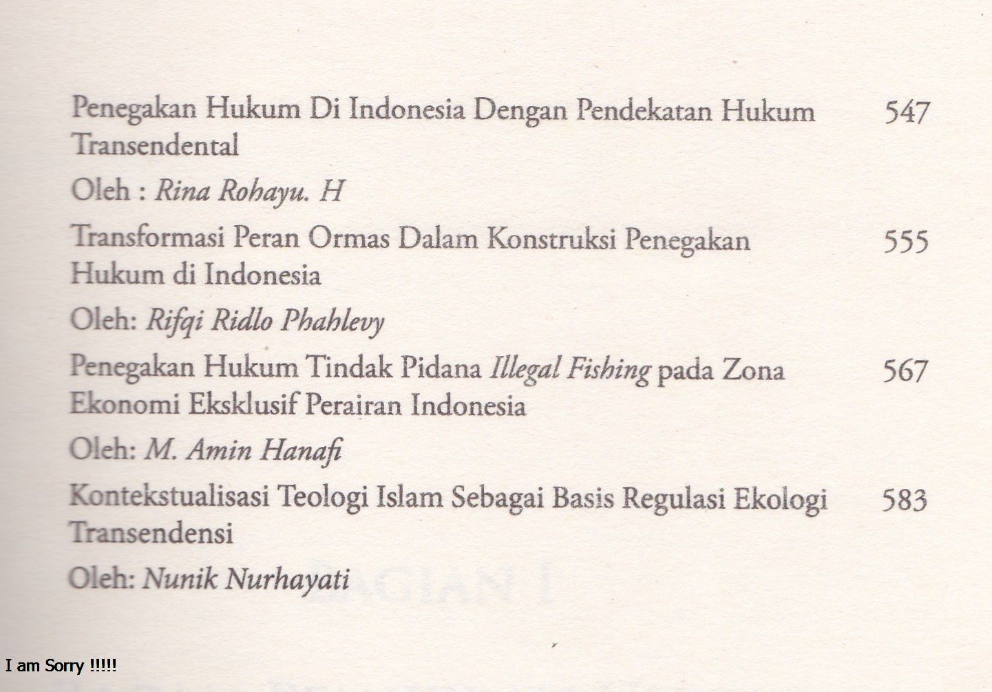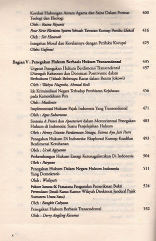 realize divine values as the highest value, humanity value, justice value, and the of expediency. Through his empirical experience in field advocacy and observations this time under President Jokowi's regime, stuttering law enforcement, being held by the interests of the authorities, and leaving ethics in punishment. The model law enforcement apparatus with a thinking model that enters the depth dimension, ndling for meaning and hidden value in the object under study. The thinking Es called spiritual thinking or spiritual intelligence. Transcendental approach in