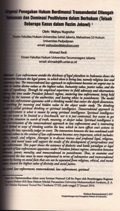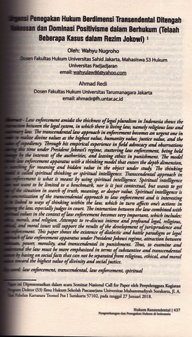 and moral issues will support the results of the development of jurisprudence and forcement. This paper shows the existence of dialectic and battle paradigm or legal de of law enforcement apparatus under President Jokowi regime, attraction between s power, morality, and transcendental in punishment. Thus, to examine and and the law must be more emphasized in terms of substantive and transcendental by basing on social facts that can not be separated from religious, ethical, and moral toward the highest value of divinity and social justice. nd law enforcement, transcendental, law enforcement, spiritual