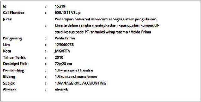 Prima, Velda (2010) Penerapan Balanced Scorecard sebagai Sistem Pengukuran Kinerja dalam Rangka Meningkatkan Keunggulan Kompetitif-Studi Kasus pada PT. Trimukti Wirapratama. Skripsi thesis, Universitas Tarumanagara.
