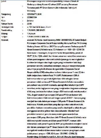 Verawaty, Juni (2010) Penerapan corporate social responsibility menurut Pasal 74 Undang-undang Nomor 40 tahun 2007 tentang Perseroan Terbatas pada PT Great Eastern Life Indonesia. Skripsi thesis, Universitas Tarumanagara.