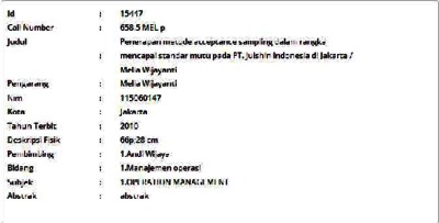 Wijayanti, Melia (2010) Penerapan Metode Acceptance Sampling dalam Rangka Mencapai Standar Mutu pada PT. Juishin Indonesia di Jakarta. Skripsi thesis, Universitas Tarumanagara.