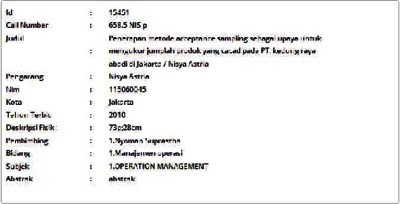 Astria, Nisya (2010) Penerapan Metode Acceptance Sampling sebagai Upaya untuk Mengukur Jumplah Produk yang Cacad pada PT. Kedung Raya Abadi di Jakarta. Skripsi thesis, Universitas Tarumanagara.