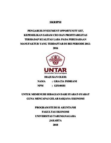 Indriani, Gracia (2018) Pengaruh investment opportunity set, kepemilikan saham CEO dan profitabilitas terhadap kualitas laba pada perusahaan manufaktur yang terdaftar di BEI periode 2012-2016/Gracia Indriani. Skripsi thesis, Universitas Tarumanagara.