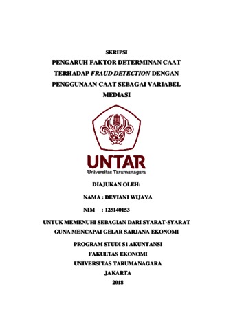Wijaya, Deviani (2018) Pengaruh faktor determinan caat terhadap fraud detection dengan penggunaan caat sebagai variabel mediasi/Deviani Wijaya. Skripsi thesis, Universitas Tarumanagara.