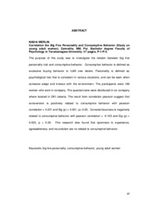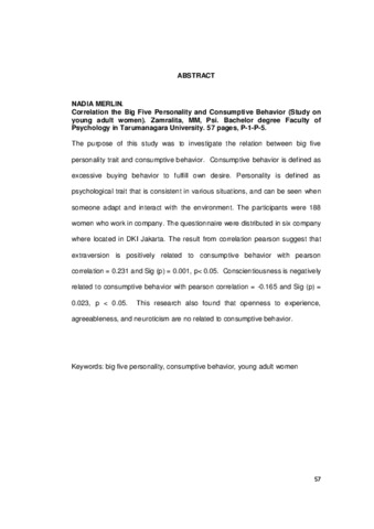 Merlin, Nadia (2010) Hubungan Antara Trait Kepribadian Big Five Dan Perilaku Konsumtif (Studi Pada Wanita Dewasa Muda). Skripsi thesis, Universitas Tarumanagara.