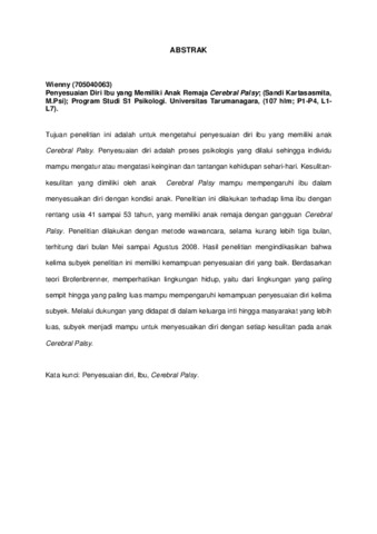 Wienny, Wienny (2008) Penyesuaian Diri Ibu Yang Memiliki Anak Remaja Cerebral Palsy. Skripsi thesis, Universitas Tarumanagara.