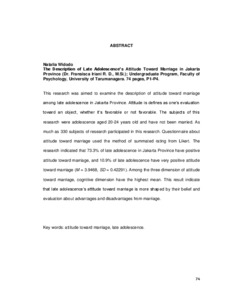 This research was aimed to examine the description of attitude toward marriage among late adolescence in Jakarta Province. Attitude is defines as one’s evaluation toward an object, whether it’s favorable or not favorable. The subjects of this research were adolescence aged 20-24 years old and have not been married. As much as 330 subjects of research participated in this research. Questionnaire about attitude toward marriage used the method of summated rating from Likert. The research indicated that 73.3% of late adolescence in Jakarta Province have positive attitude toward marriage, and 10.9% of late adolescence have very positive attitude toward marriage (M = 3.9468, SD = 0.42291). Among the three dimension of attitude toward marriage, cognitive dimension have the highest mean. This result indicate that late adolescence’s attitude toward marriage is more shaped by their belief and evaluation about advantages and disadvantages from marriage.