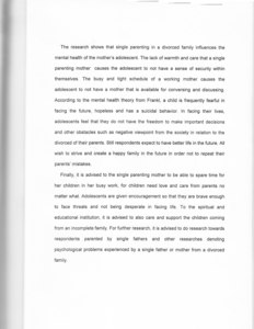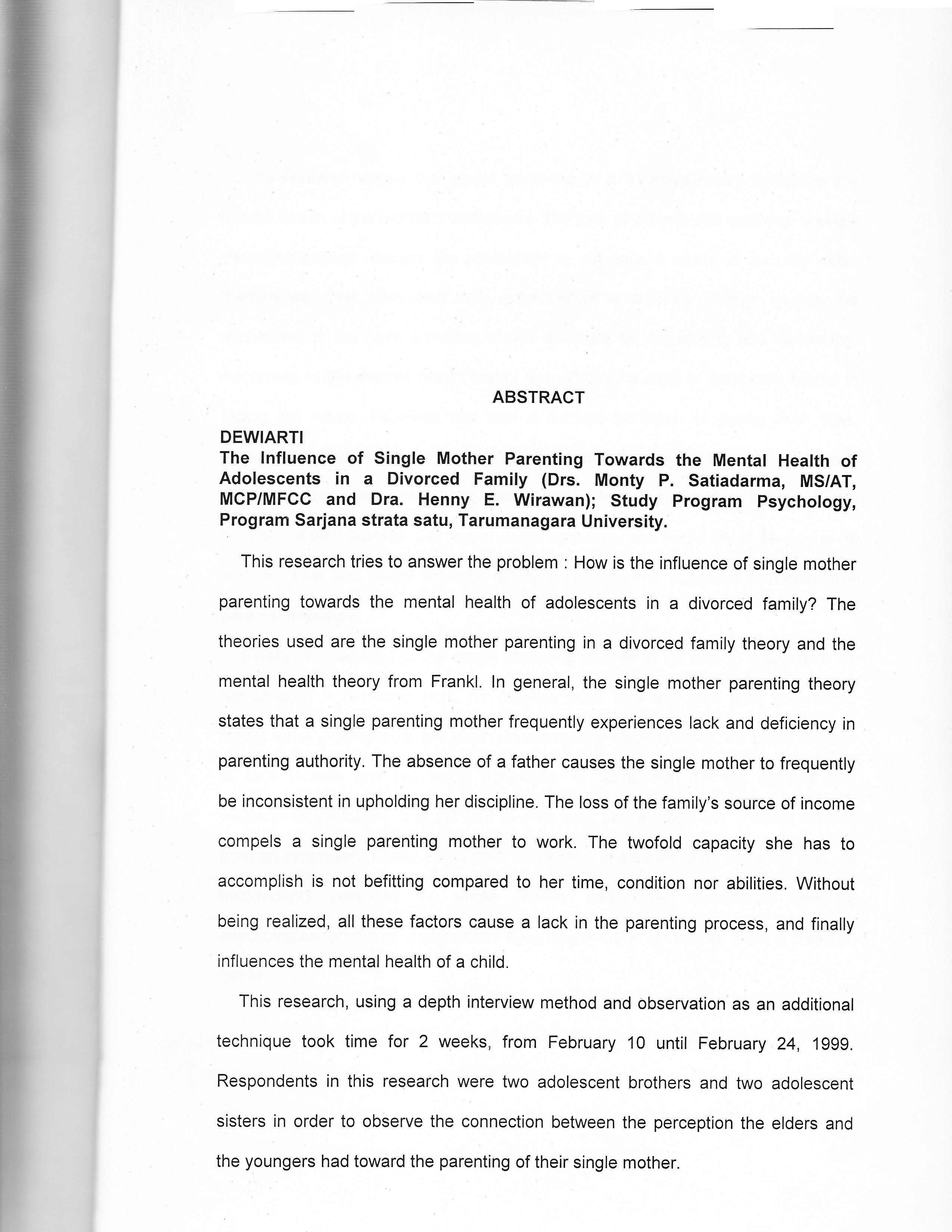 "This research tries to answer the problem : How is the influence of single mother parenting towards the mental health of adolescents in a divorced family? The theories used are the single mother parenting in a divorced family theory and the mental health theory from Frank]. In general, the single mother parenting theory states that a single parenting mother frequently experiences lack and deficiency in parenting authority. The absence of a father causes the single mother to frequently be inconsistent in upholding her discipline. The loss of the family's source of income compels a single parenting mother to work. The twofold capacity she has to accomplish is not befitting compared to her time, condition nor abilities. Without being realized, all these factors cause a lack in the parenting process, and finally influences the mental health of a child. This research, using a depth interview method and observation as an additional technique took time for 2 weeks, from February 10 until February 24, 1999. Respondents in this research were two adolescent brothers and two adolescent sisters in order to observe the connection between the perception the elders and the youngers had toward the parenting of their single mother. The research shows that single parenting in a divorced family influences the mental health of the mother's adolescent. The lack of warmth and care that a single parenting mother causes the adolescent to not have a sense of security within themselves. The busy and tight schedule of a working mother causes the adolescent to not have a mother that is available for conversing and discussing. According to the mental health theory from Frank!, a child is frequently fearful in facing the future, hopeless and has a suicidal behavior. In facing their lives, adolescents feel that they do not have the freedom to make important decisions and other obstacles such as negative viewpoint from the society in relation to the divorced of their parents. Still respondents expect to have better life in the future. All wish to strive and create a happy family in the future in order not to repeat their parents' mistakes. Finally, it is advised to the single parenting mother to be able to spare time for her children in her busy work, for children need love and care from parents no matter what. Adolescents are given encouragement so that they are brave enough to face threats and not being desperate in facing life. To the spiritual and educational institution, it is advised to also care and support the children coming from an incomplete family. For further research, it is advised to do research towards respondents parented by single fathers and other researches denoting psychological problems experienced by a single father or mother from a divorced family.