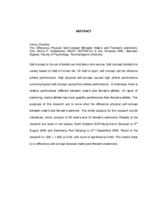 Konsep diri merupakan keseluruhan pemikiran seseorang mengenai diri sendiri. Konsep diri terbagi atas berbagai aspek yang didasarkan pada bidang kehidupan manusia. Dimensi konsep diri digolongkan ke dalam dua bidang yaitu, akademik dan non-akademik. Pada bidang akademik, dimensi konsep diri mencakup materi pelajaran sekolah. Sedangkan pada bidang non-akademik, dimensi konsep diri mencakup konsep diri sosial, emosional, dan fisik. Pada bidang olahraga, konsep diri fisik dapat mempengaruhi prestasi atlet. Konsep diri fisik yang tinggi dapat menyebabkan seorang atlet memiliki prestasi yang tinggi, begitu pula sebaliknya. Di Indonesia, terdapat prestasi yang relatif berbeda antara atlet pria dan wanita. Pada olahraga renang, atlet pria memiliki jumlah prestasi lebih banyak dibandingkan wanita. Tujuan dari penelitian ini adalah untuk mengetahui apakah ada perbedaan konsep diri fisik antara atlet renang pria dan wanita. Subyek penelitian adalah 36 orang atlet renang pria dan 32 orang atlet renang wanita. Pengambilan data dilakukan di dua tempat yaitu, Stadion Renang GOR Bung Karno Senayan pada tanggal 2 Agustus 2006, dan Kolam Renang Pertamina Simprug pada tanggal 21 September 2006. Berdasarkan hasil pengolahan data, diperoleh nilai t(66)=1.659, p>0.05, dengan mengacu pada nilai signifikansi sebesar 0.102. Hal ini menunjukkan bahwa tidak terdapat perbedaan konsep diri fisik antara atlet renang pria dan wanita.