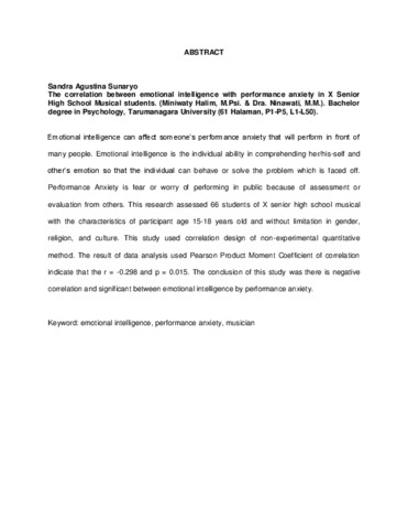 Agustina Sunaryo, Sandra (2011) Hubungan Kecerdasan Emosional Dengan Performance Anxiety Pada Siswa Sekolah Menengah Kejuruan Musik X. Skripsi thesis, Universitas Tarumanagara.