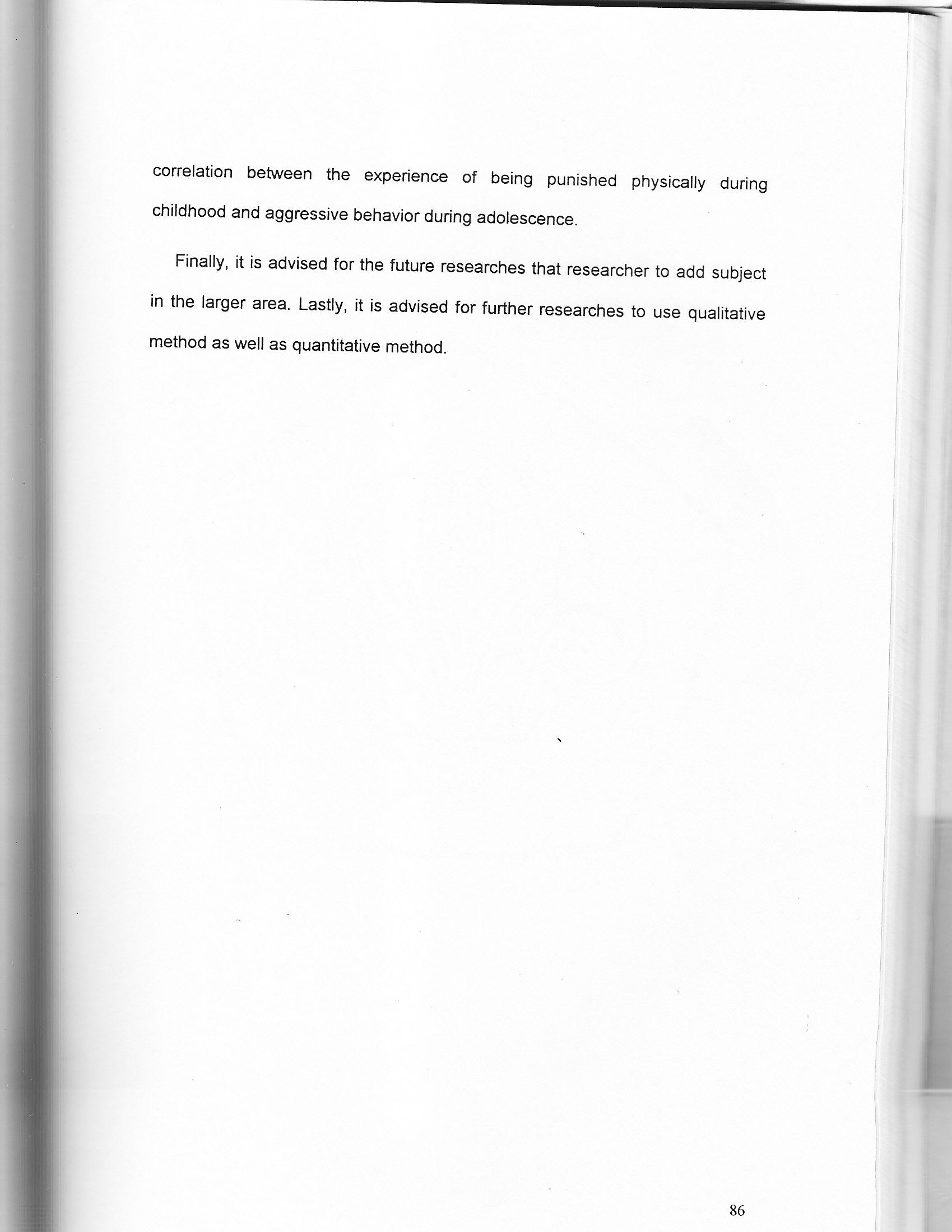 Result obtained from data processed by Pearson Product Moment tecnique (used SPSS for MS WINDOWS New Release 9.0) is r +0,636 that sign= 0,048. This shows that the researches's hypothesis is accepted, that show there is correlation between the experience of being punished physically during