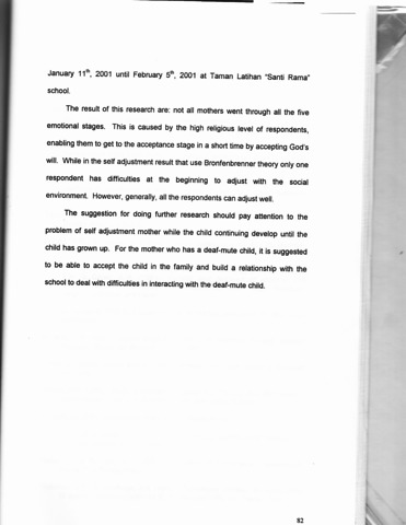 It is a difficult situation for a mother to have a deaf-mute child in the family, especially if the mother cannot accept and adapt with the child condition. This research tries to study the self adjustment of a mother who has a deaf-mute child. There are two theories used, the first one is "Stages Theory" from Opihory and Peters about emotional reaction from a mother who has a deaf-mute child. The stages are: Shock and Denial, Anger, Bargaining, Depression, and Acceptance. The second one is the problem of adjustment made the mothers who have deaf-mute children is Bronfenbrenner theory. Five contexts influence this adjustment are: The Ontogenic System — a system that emphasize on individual, while the other four are Human Ecological factor, which influence human development through four systems: The Microsystem (the self adjustment of the deaf-mute child's mother with family); The Exosystem (the self adjustment of the deaf-mute child's mother with the social environment outside the family); The Mesosystem (the self adjustment of the deaf-mute child's mother with school environment); and The Macrosystem (the self adjustment of the deaf-mute child's mother with the culture and society's values). This research uses qualitative method was conducted by using with depth interview to explore the self adjustment of the deaf-mute child's mothers. There are 4 (four) deaf-mute child mother who become respondents and they have a deaf-mute child under four years old. This interview was held within period of January 111h, 2001 until February 5th, 2001 at Taman Latihan "Santi Rama" school. The result of this research are: not all mothers went through all the five emotional stages. This is caused by the high religious level of respondents, enabling them to get to the acceptance stage in a short time by accepting God's will. While in the self adjustment result that use Bronfenbrenner theory only one respondent has difficulties at the beginning to adjust with the social environment. However, generally, all the respondents can adjust well. The suggestion for doing further research should pay attention to the problem of self adjustment mother while the child continuing develop until the child has grown up. For the mother who has a deaf-mute child, it is suggested to be able to accept the child in the family and build a relationship with the school to deal with difficulties in interacting with the deaf-mute child.