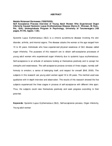 Systemic Lupus Erythematosus (SLE) is a chronic autoimmune disease involving the skin disorder, arthritis, and internal organs. The disease attacks the woman at the age ranged from 15 to 45 years. Individuals who have experienced physical weakness of SLE disease called organ inferiority. The purposes of this research are to obtain self-acceptance processes of young adult woman who experienced organ inferiority due to systemic lupus erythematosus. Self-acceptance is an attitude of someone looking at themselves positively and to accept her strengths and weaknesses. The self-acceptance process consists of three stages, namely self-honesty to emotion, a sense of belonging itself, and respect for oneself (Brill, 2000). The subjects in this research are young adult women aged 19 to 29 years. The method used was qualitative with in-depth interview and observation. The results of this research showed the five subjects experienced the three stages in process of self-acceptance with different time span. Thus, the subjects could view themselves positively and seek progress according to their potential.