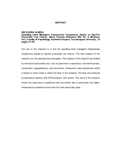 Almesa, Inri Kurnia (2007) Kompetensi Interpersonal Pada Manajer Level Operasional (Ditinjau Dari Teori Trait Kepribadian Big-Five). Skripsi thesis, Universitas Tarumanagara.
