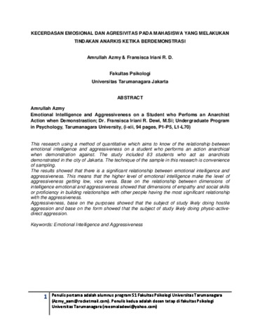 Azmy, Amrullah (2012) Kecerdasan Emosional Dan Agresivitas Pada Mahasiswa Yang Melakukan Tindakan Anarkis Ketika Berdemonstrasi. Skripsi thesis, Universitas Tarumanagara.