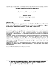 This research using a method of quantitative which aims to know of the relationship between emotional intelligence and aggressiveness on a student who performs an action anarchical when demonstration against. The study included 83 students who act as anarchists demonstrated in the city of Jakarta. The technique of the sample in this research is convenience of sampling. The results showed that there is a significant relationship between emotional intelligence and aggressiveness. This means that the higher level of emotional intelligence make the level of aggressiveness getting low, vice versa. Base on the relationship between dimensions of intelligence emotional and aggressiveness showed that dimensions of empathy and social skills or proficiency in building relationships with other people having the most significant relationship with the aggressiveness. Aggressiveness, base on the purposes showed that the subject of study likely doing hostile aggression and base on the form showed that the subject of study likely doing physic-active-direct aggression.